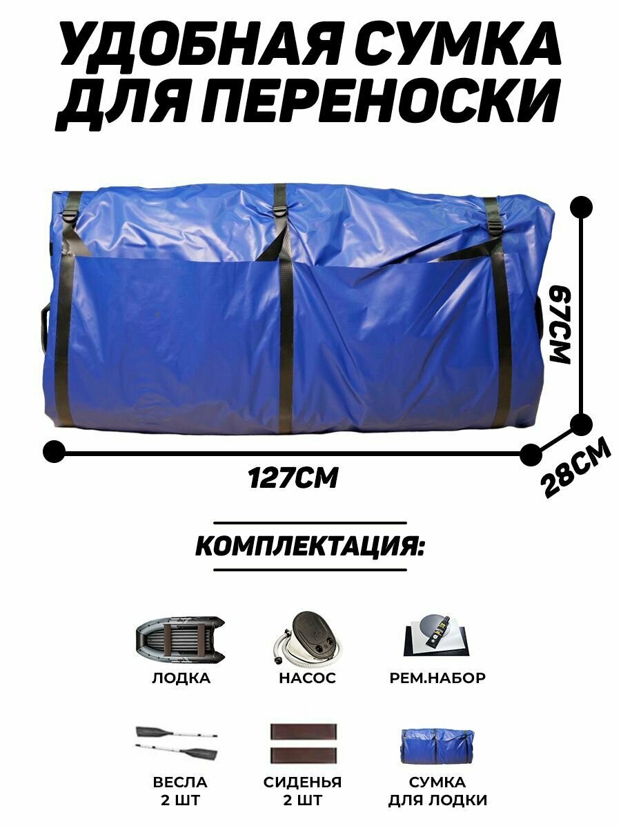 | Состав набора | Лодка, 2 сиденья, 2 весла разборных, ножной насос 5 литров, рем. набор, сумка, паспорт изделия |