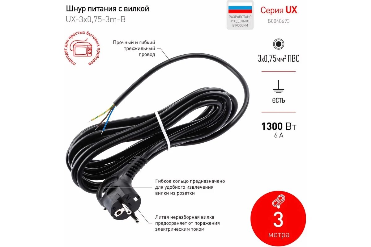 Шнур сетевой с вилкой 3м с заземл. ПВС 3х0.75 черн. UX-3x0.75-3m-B ЭРА Б0048693