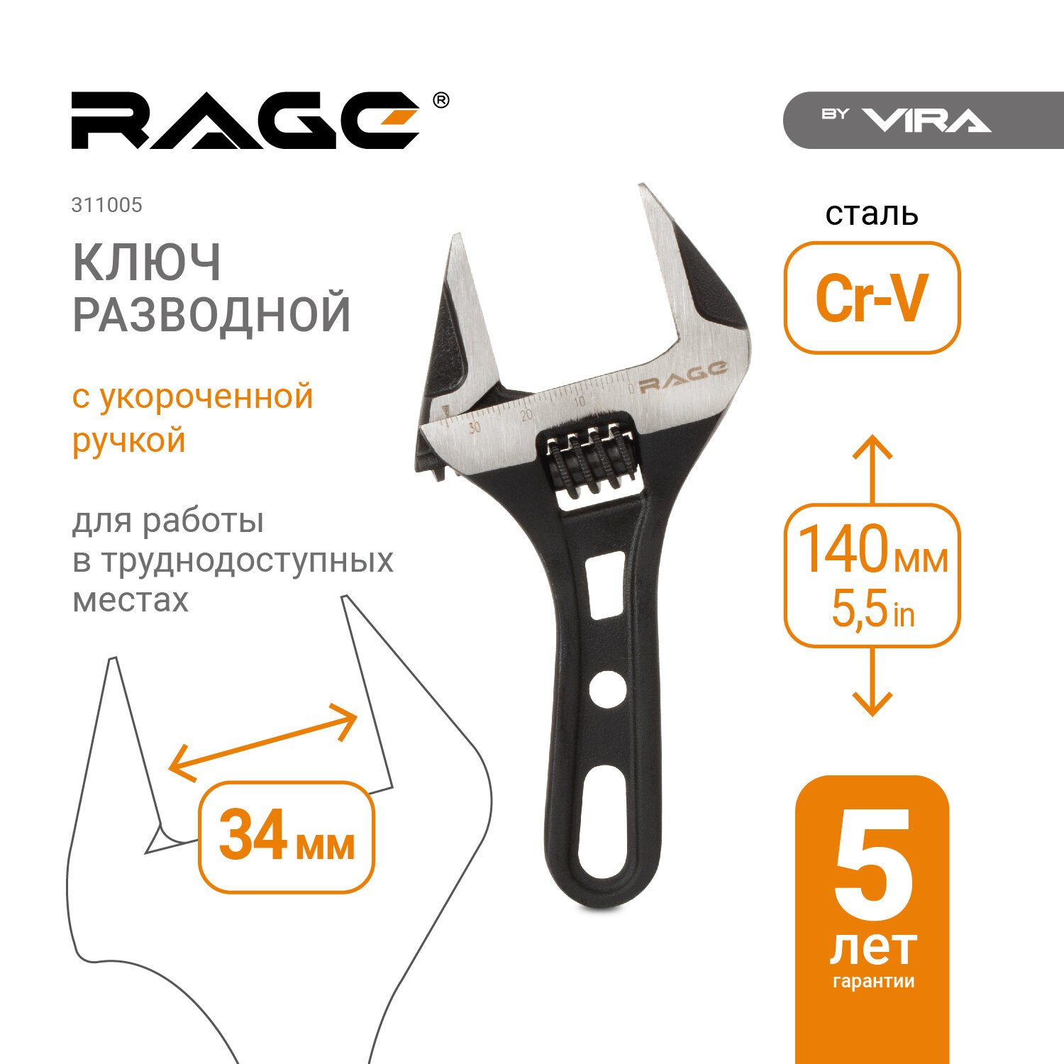 Разводной ключ VIRA с укороченной ручкой, 140 мм RAGE by 311005