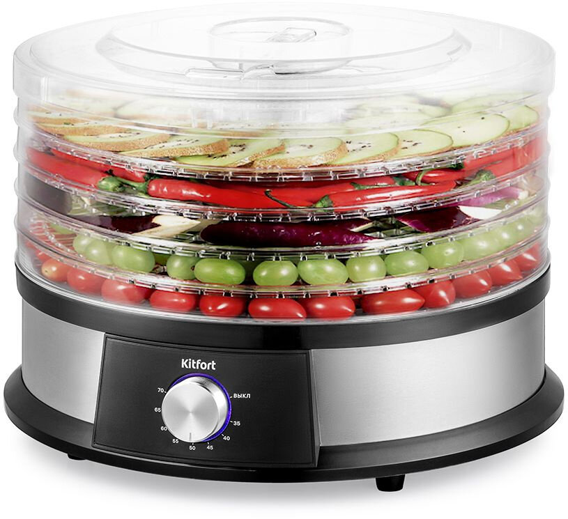 Сушилка для овощей и фруктов KitFort КТ-1930, нержавеющая сталь/черный, 5 поддонов информация: