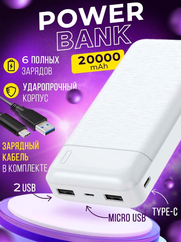 Портативный внешний аккумулятор 20000 mAh/Power Bank/ 2 USB + Type-C + MicroUSB/ Индикатор заряда информация: