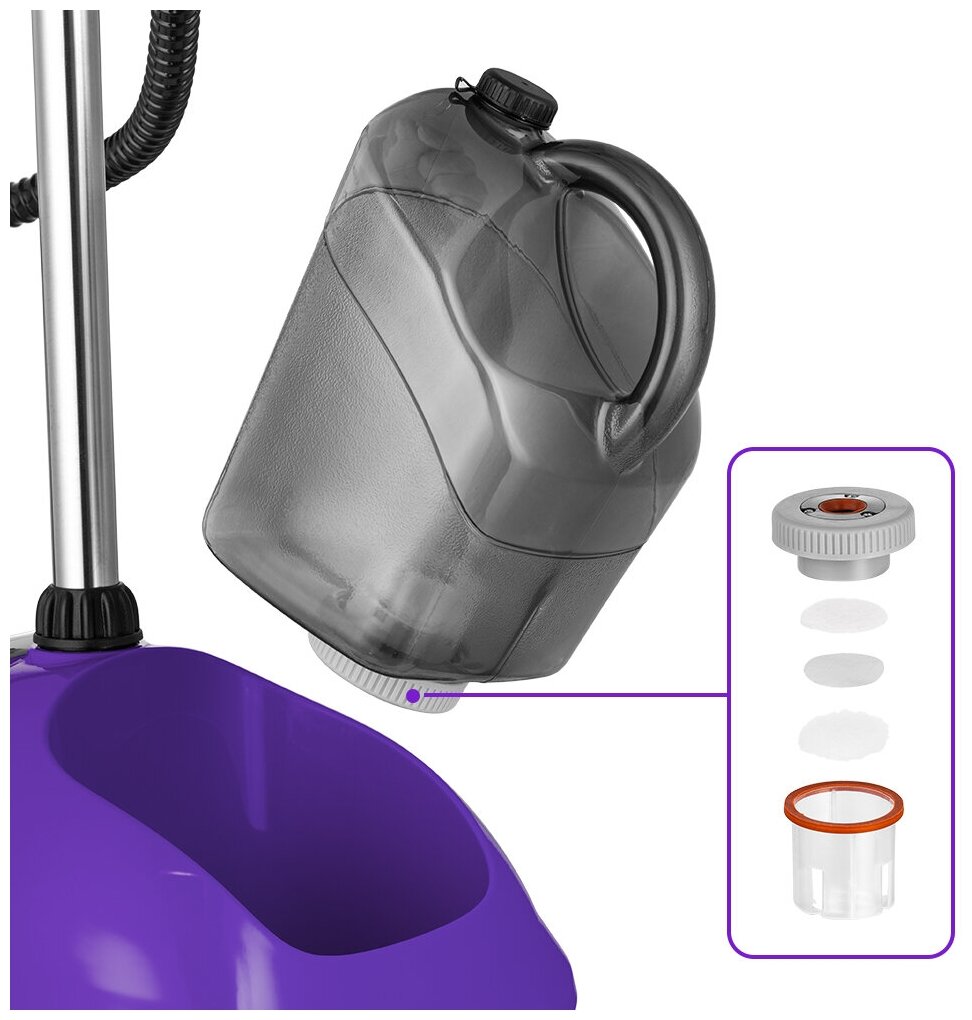 | Дополнительная информация | Комплектация 1. Отпариватель с крышкой разъема парового шланга — 1 шт. 2. Паровой шланг с утюжком — 1 шт. 3. Резервуар для воды с крышкой и блоком фильтров — 1 шт. 4. Телескопическая стойка с гайкой — 1 шт. 5. Держатель утюжка — 1 шт. 6. Складная вешалка с фиксатором — 1 шт. 7. Ворсовая щетка-зажим — 1 шт. 8. Щетка из микрофибры — 1 шт. 9. Защитная варежка — 1 шт. 10. Руководство по эксплуатации — 1 шт. 11. Коллекционный магнит — 1 шт.* *опционально |