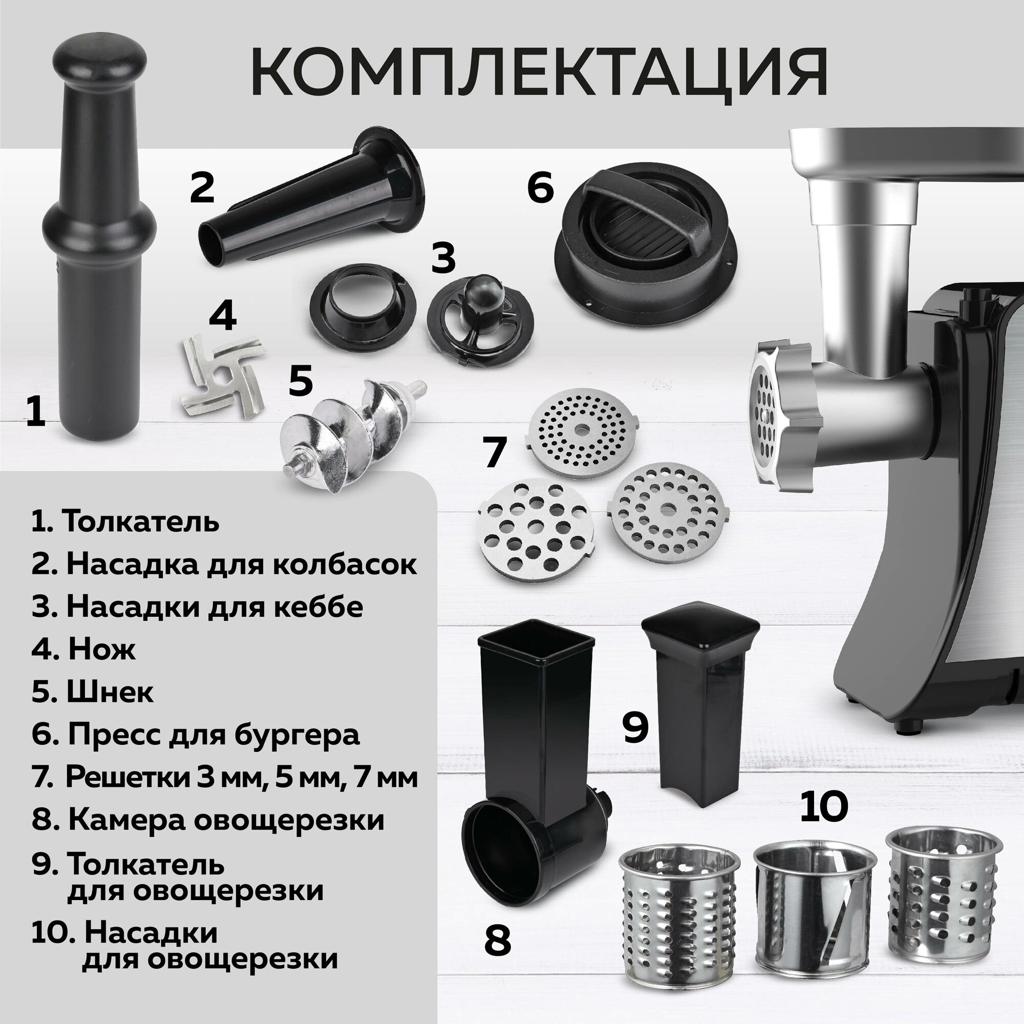 | Насадки | насадка для кеббе / насадка для приготовления колбас / насадка для шинковки / формочка для фарша |