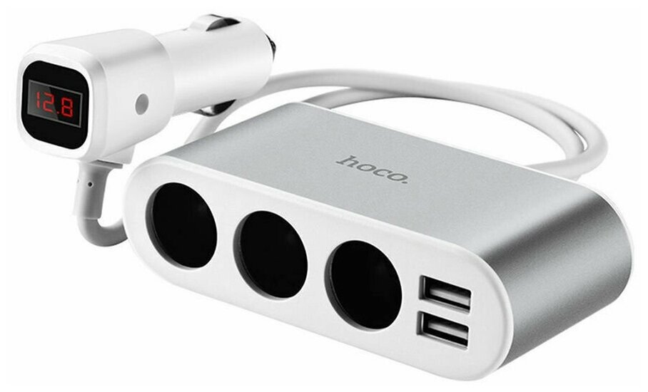 Разветвитель прикуривателя HOCO Z13 + 2USB с цифровым дисплеем, 2,1A, серебристый