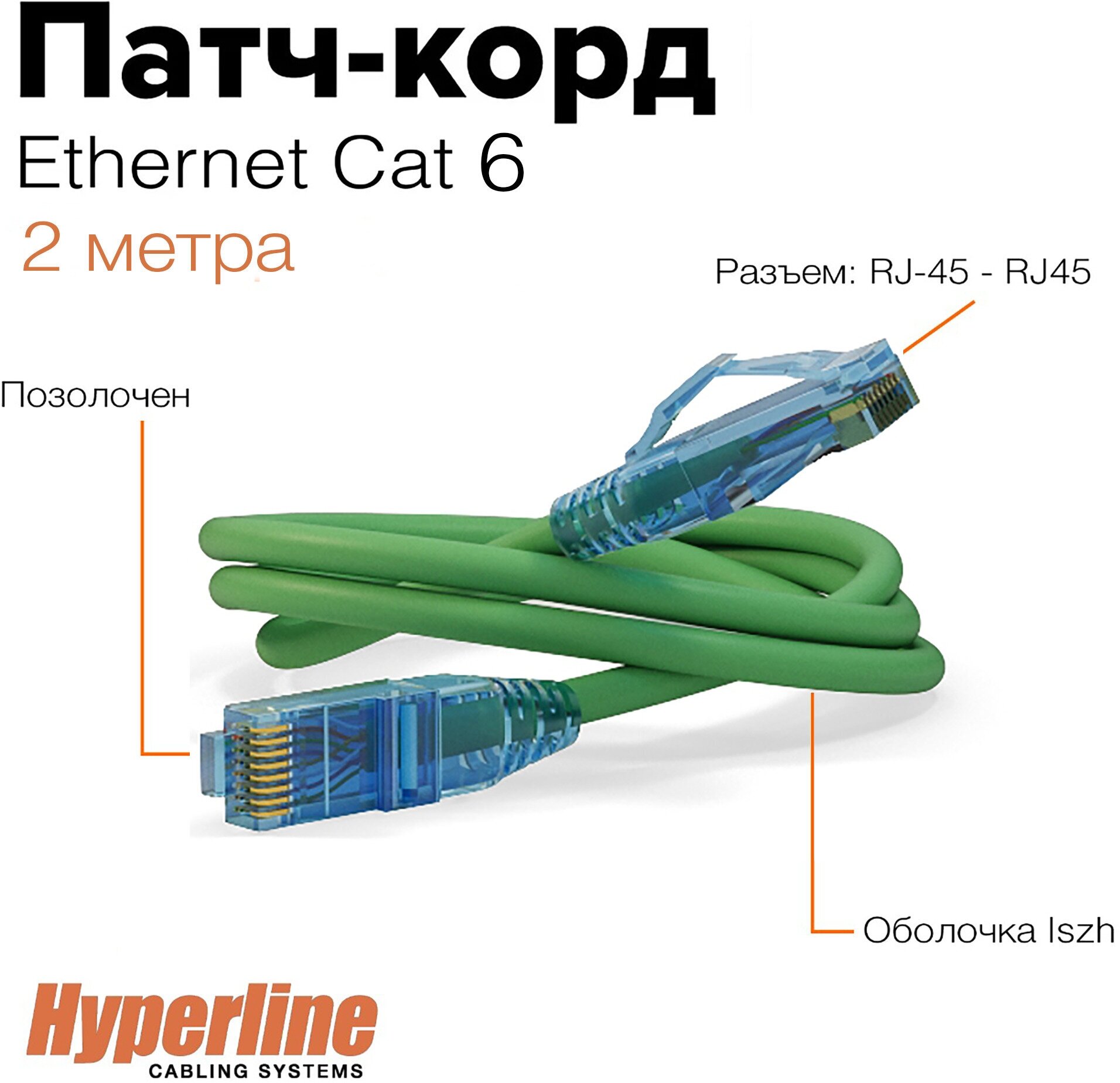 Патч-корд Hyperline U/UTP, Cat.6 (100% Fluke Component Tested), LSZH, 2 м, зеленый