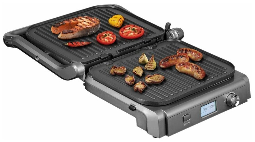 | Особенности | антипригарное покрытие / поддон для сбора жира / антипригарное покрытие / съемные панели/раскрытие на 180 гр/защита от перегрева |