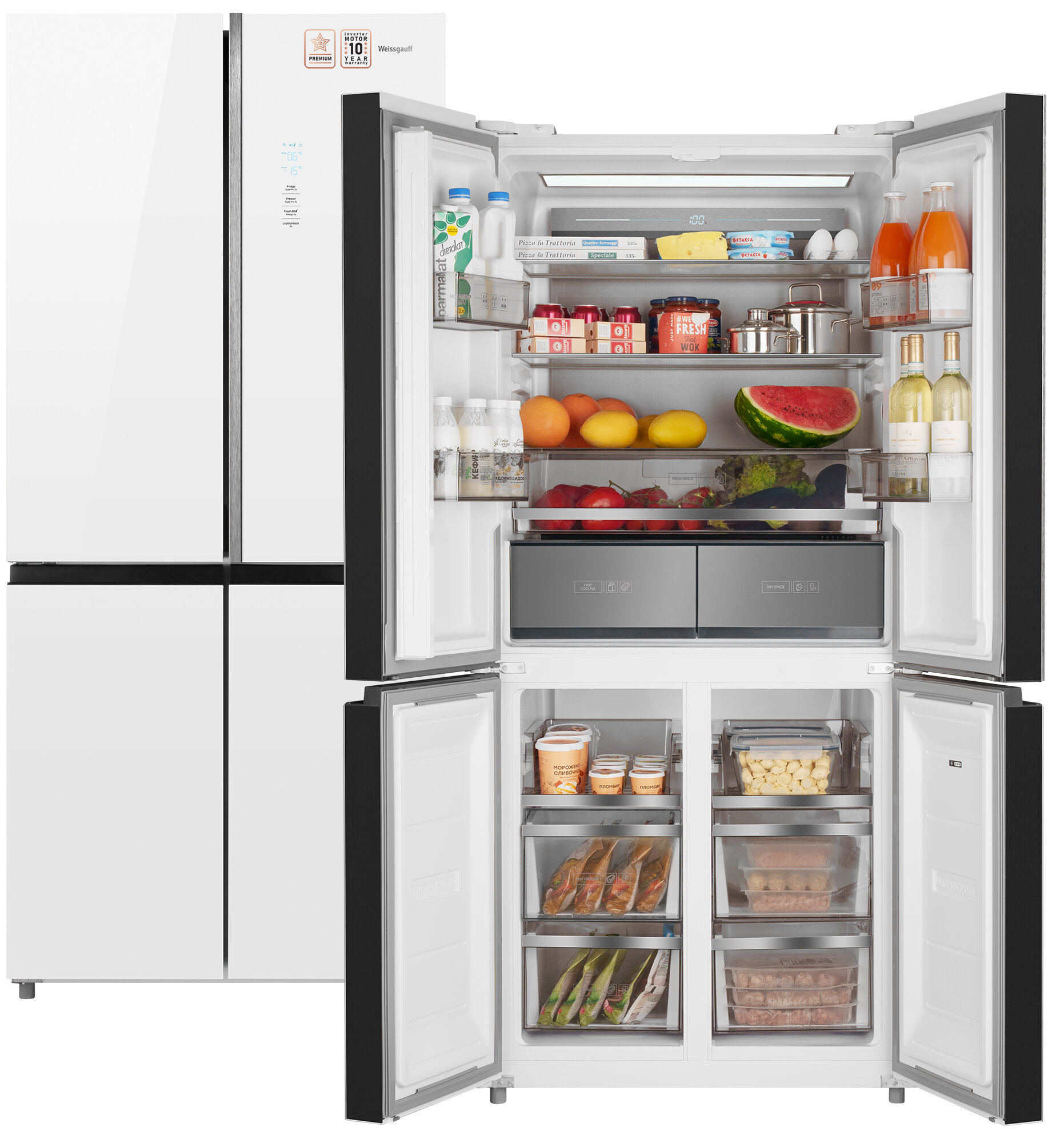 Отдельностоящий холодильник с инвертором Weissgauff WCD 590 Nofrost Inverter Premium EcoFresh White Glass, CrossDoor, технологии Multi Air Flow, Metal-Tech Cooling, суперохлаждение, суперзаморозка 112 025 ₽