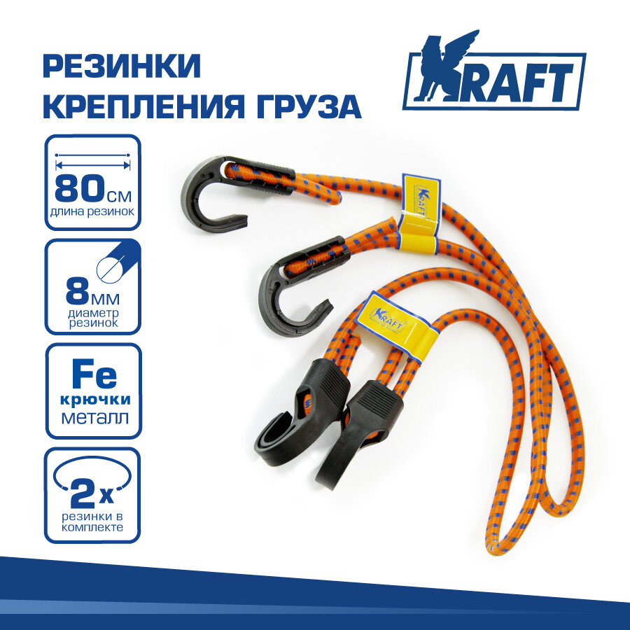 Набор резинок в багажник (80 см) "KRAFT" (D=8 мм, пласт. крючки) (2 шт.) 482 ₽