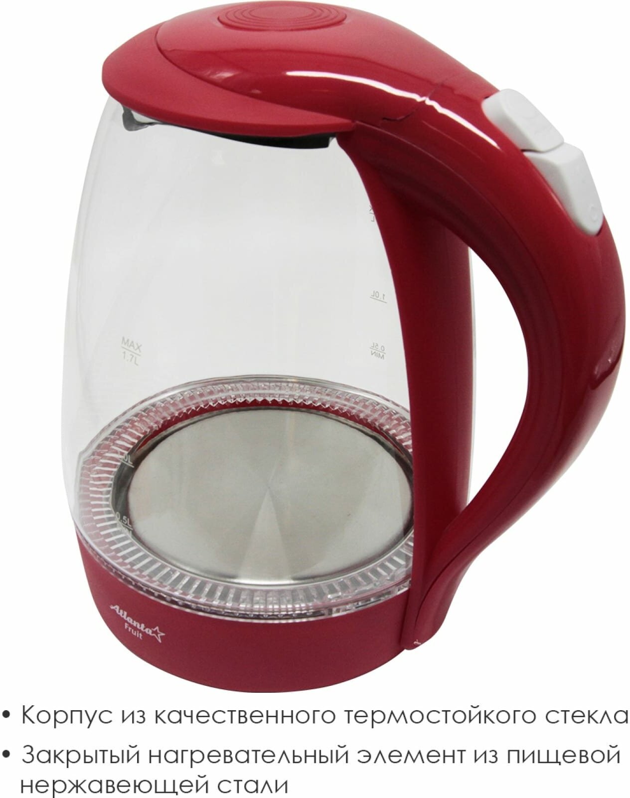 Чайник электрический ATLANTA ATH-2461 1,7л стекло красный информация: