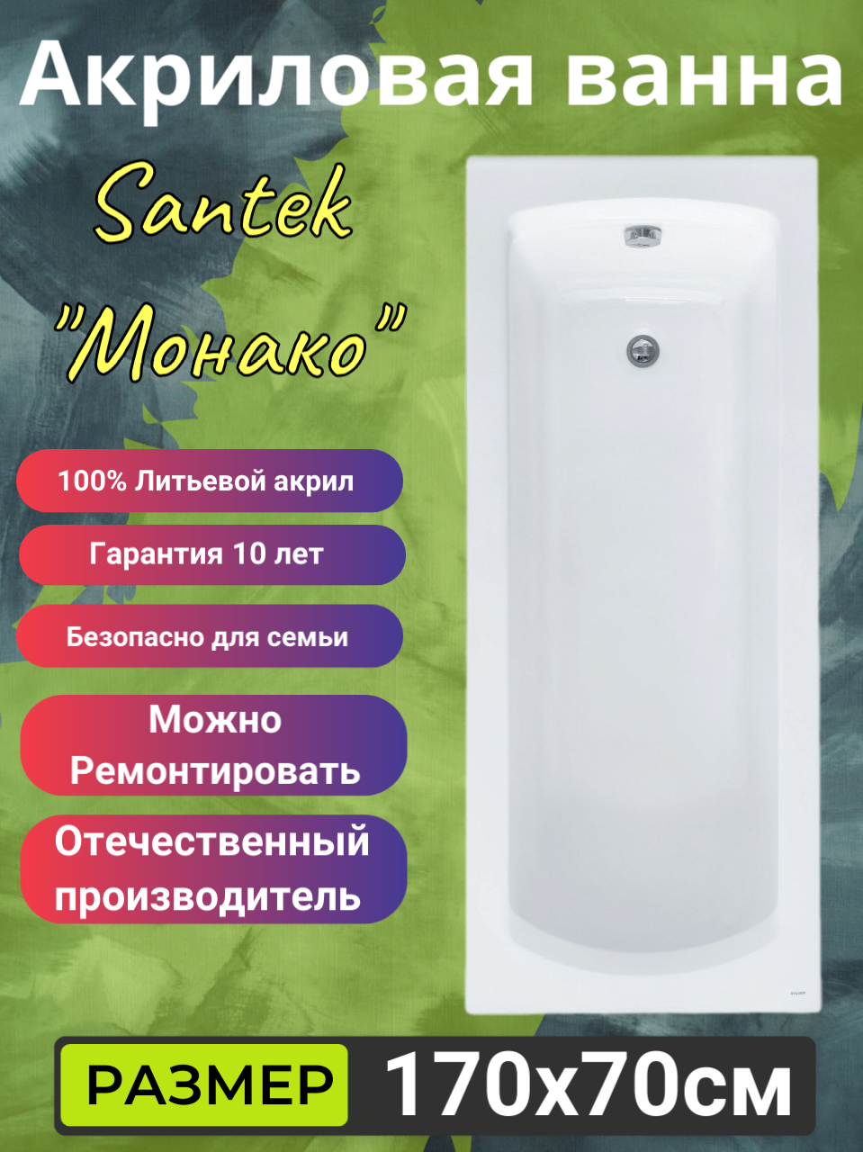 Ванна акриловая Santek Монако 170x70 белая 1.WH11.1.979 информация: