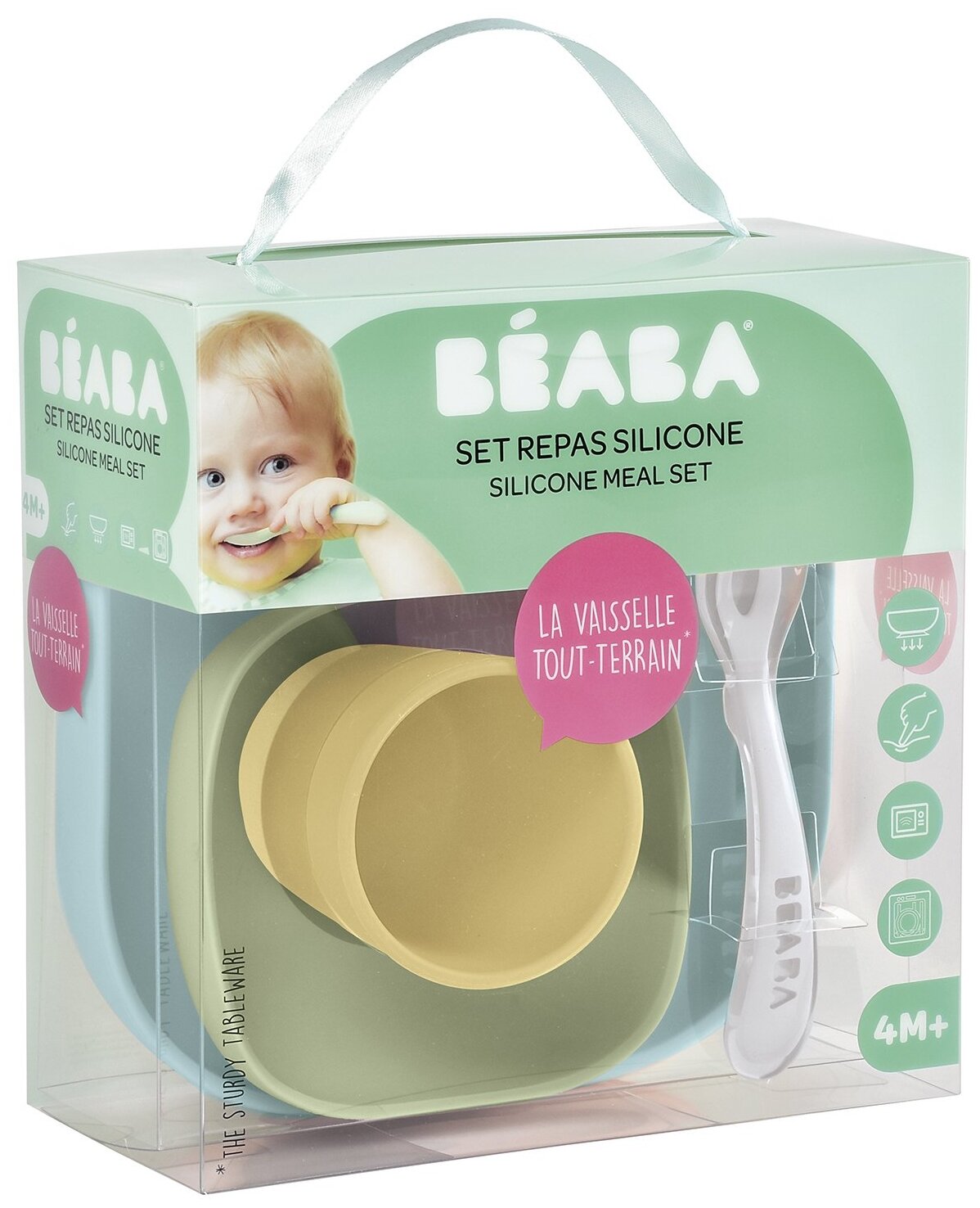 Набор силиконовой детской посуды BEABA: секционная тарелка на присоске, силиконовая кружка с ручками, ложка детская для кормления и прикорма