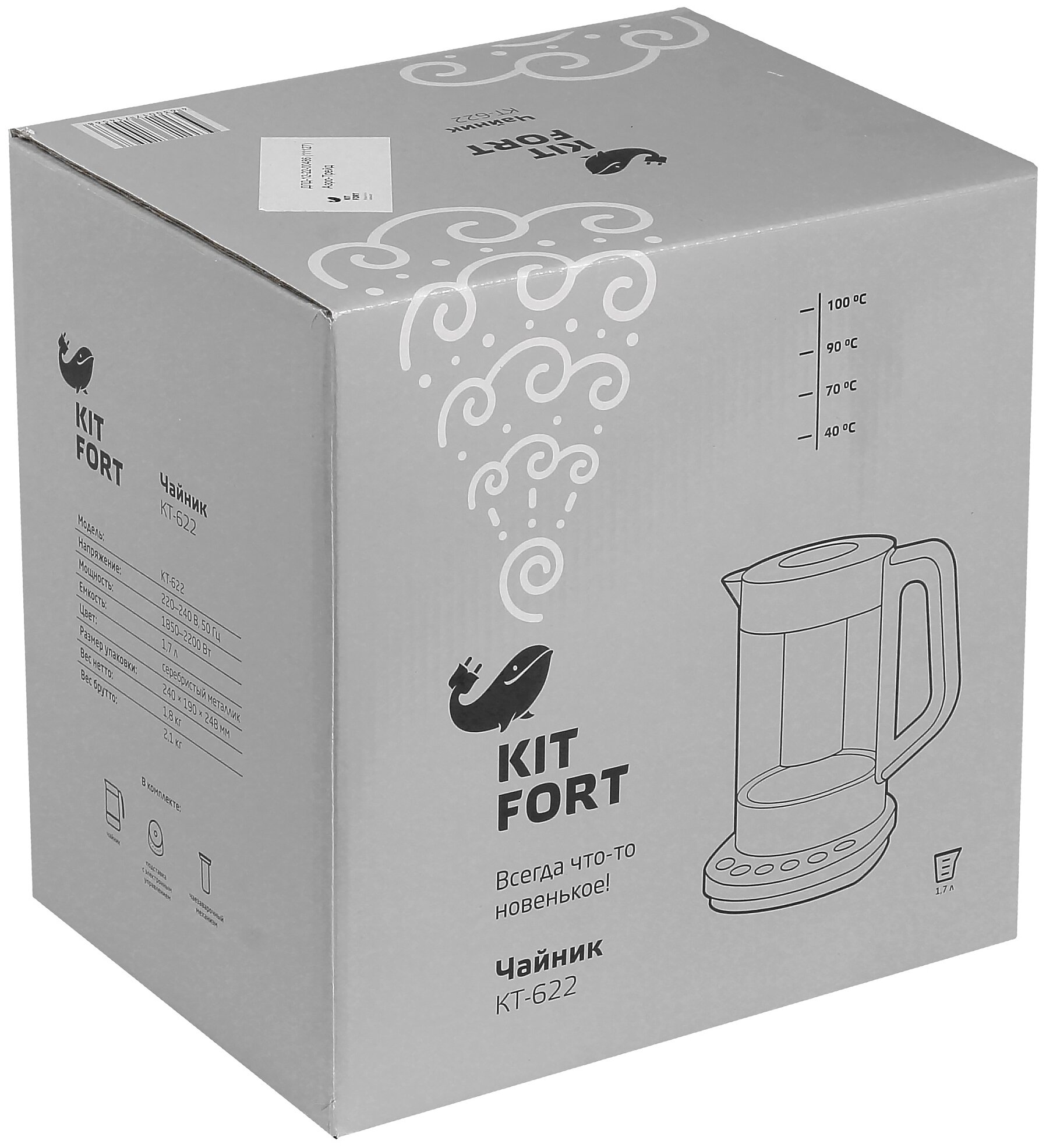 Чайник KITFORT КТ-622, 1,7 л, 2200 Вт, закрытый нагревательный элемент, терморегулятор, заварник, стекло, серебро - 1 шт.