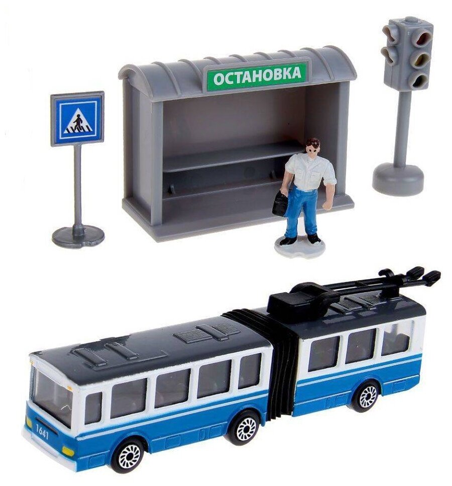 Набор металлических машин «Троллейбус с остановкой и аксессуарами», 12 см 1 110 ₽