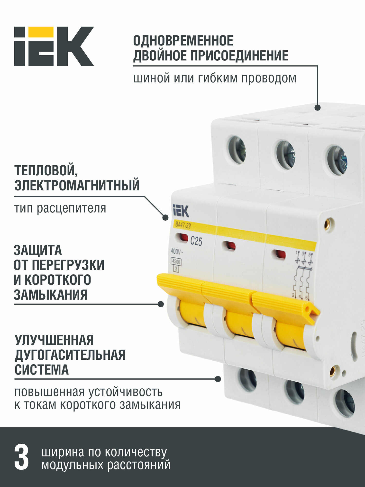 Автоматический выключатель IEK ВА 47-29 (MVA20-3-025-C) 3P 25А тип C 4,5 кА 400 В на DIN-рейку 636 ₽