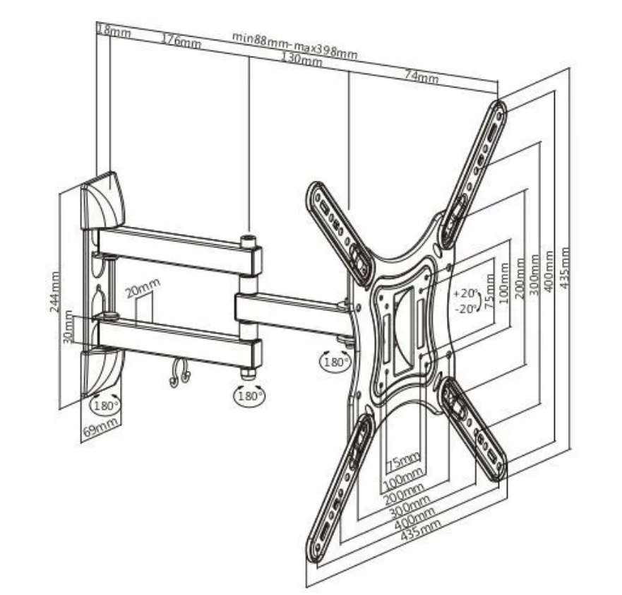 Кронштейн настенный Ultramounts UM870 для ТВ 23-55", до 30кг, наклон до 20°, поворот на 90°, от стены 88-398мм, max VESA 400х400, черное