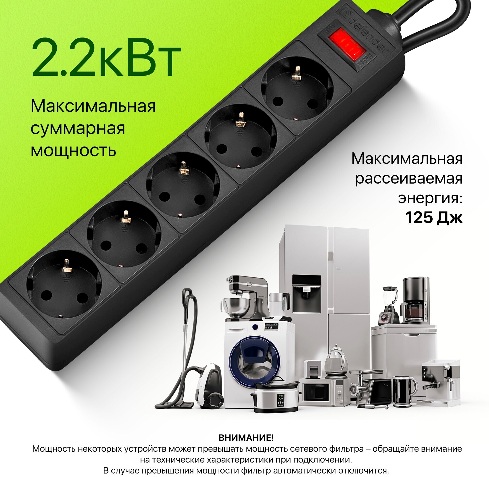 Сетевой фильтр - удлинитель Defender 5 розеток с заземлением , 1.8 метра , выключатель , черный информация:
