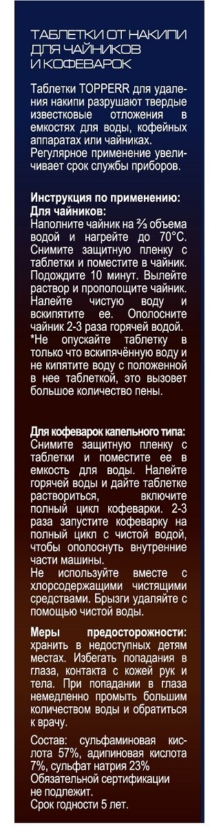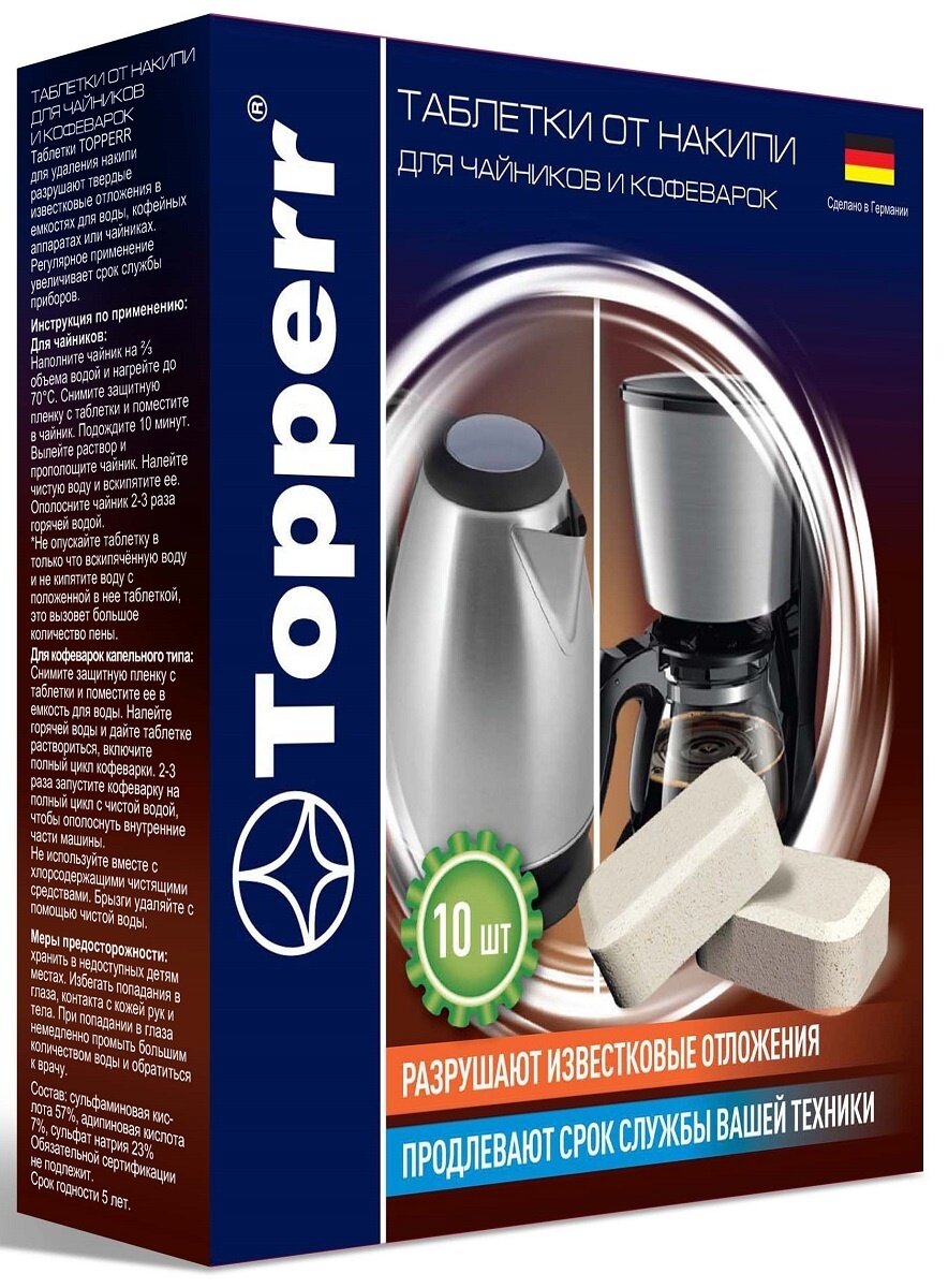 Таблетки от накипи для чайников и кофеварок TOPPERR 3043, 10 шт. информация: