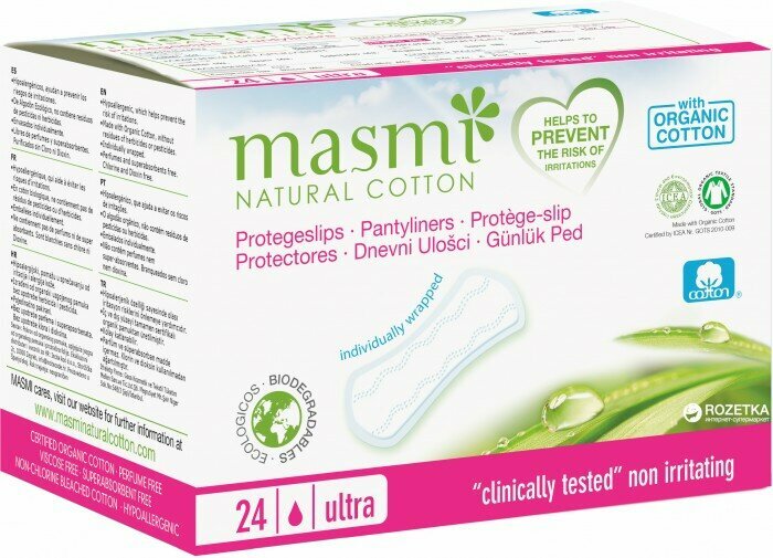 MASMI NATURAL COTTON. Ежедневные ультратонкие гигиенические прокладки из органического хлопка в индивидуальной упаковке 24шт