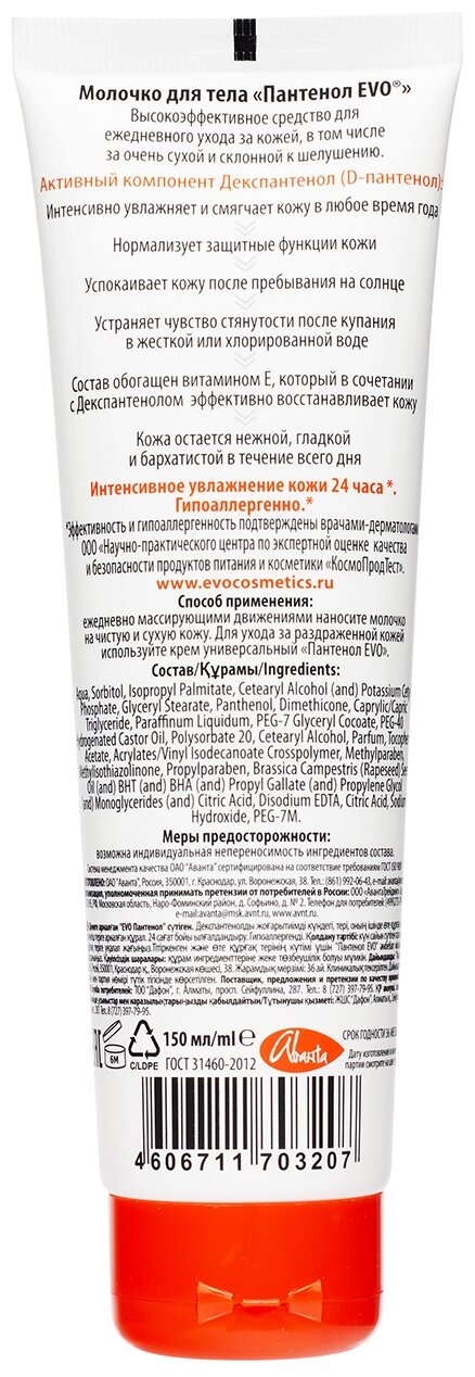 Молочко для тела, Evo, Пантенол, увлажнение, 150 мл информация: