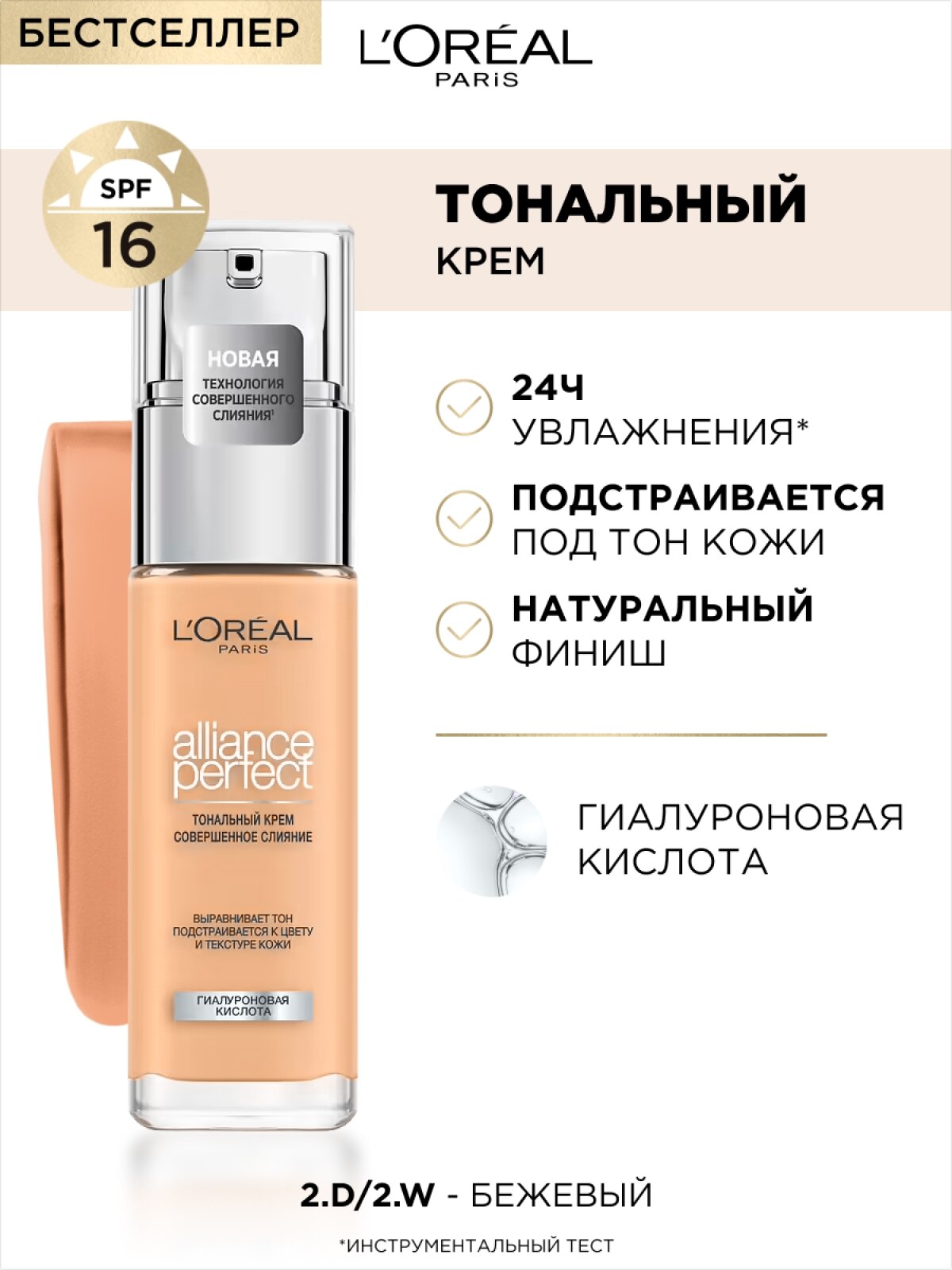 L'Oreal Paris, Тональный крем ALLIANCE PERFECT совершенное слияние обогащенный гиалуроновой кислотой, тон 2.D / 2.W, SPF 16, 30 мл 1 087 ₽