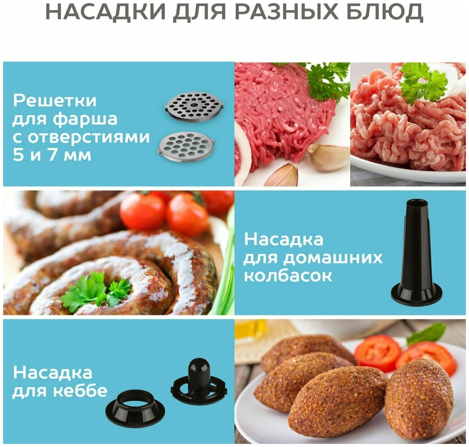 Мясорубка Scarlett SC-MG45S58 электрическая с решетками 5 и 7 мм, реверсом, насадками для колбасок и кеббе и ручкой для переноски, 1900 Вт