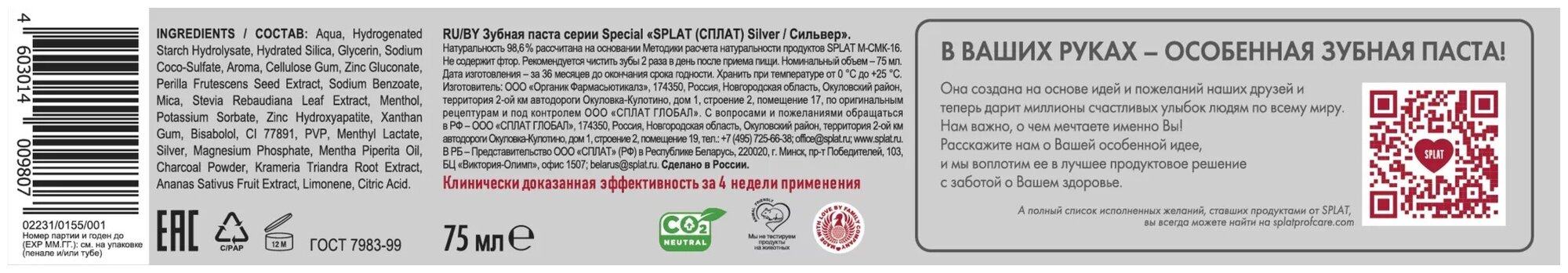 Зубная паста Splat Special Silver, 75 мл информация: