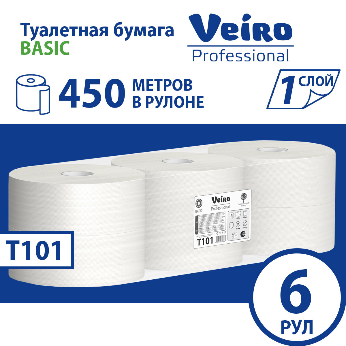 T101 Туалетная бумага в больших рулонах Veiro Professional Basic однослойная (6 рул х 450 м)