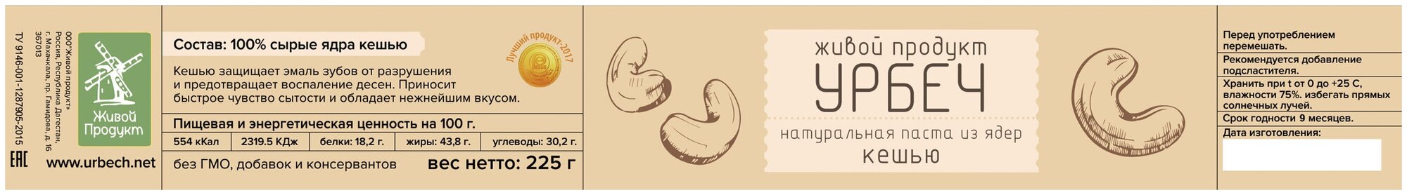 Урбеч из ядер кешью Живой продукт 225 г 1 шт информация: