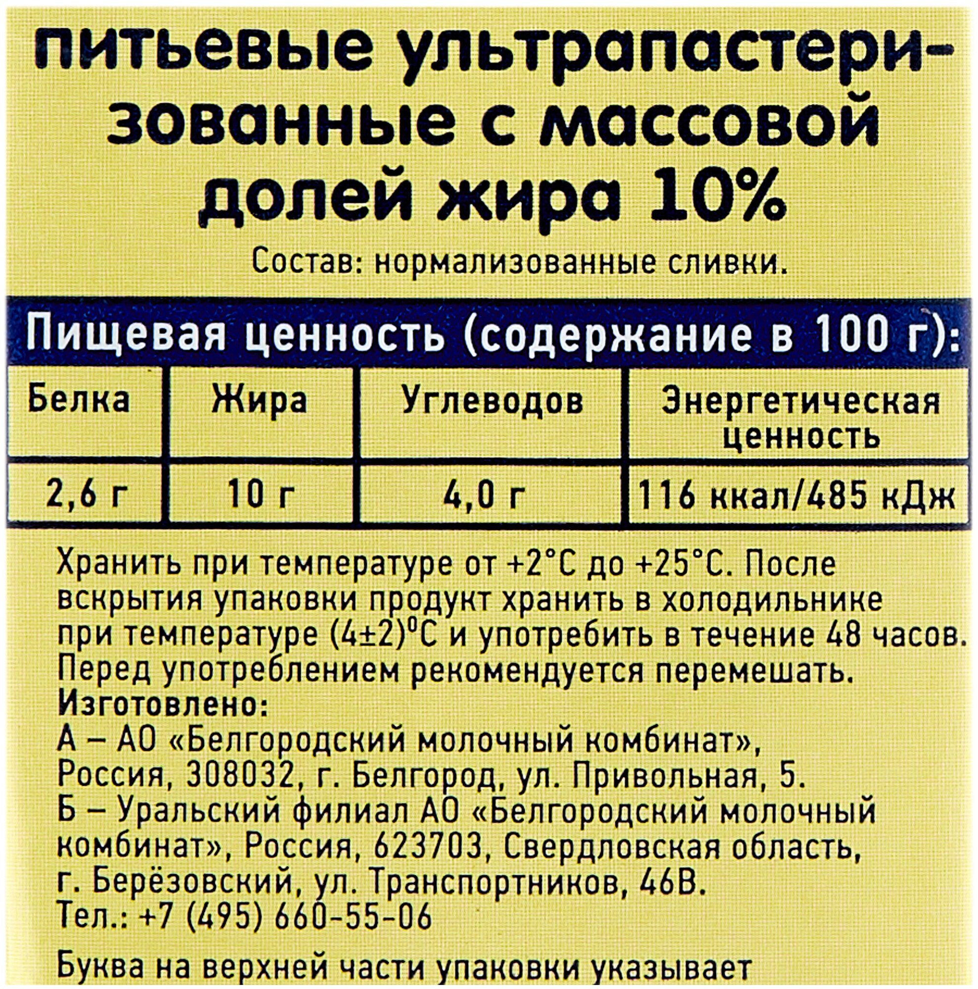 Сливки ультрапастеризованные Белый город 10%, 500гр информация: