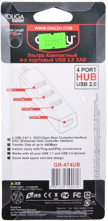 Ginzzu Контроллер HUB GR-474UB USB 2.0 4 port, 1,1m cable информация: