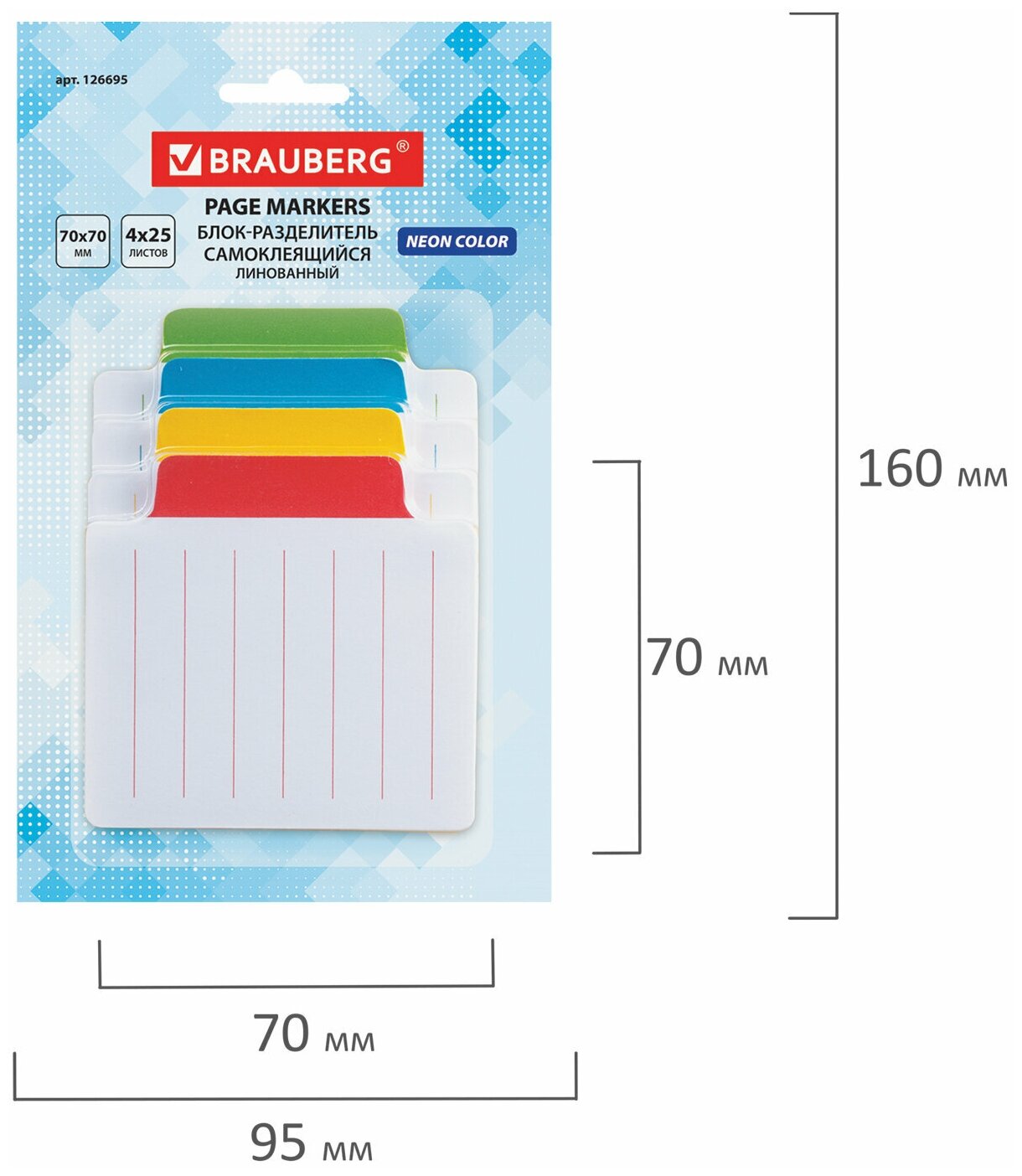 Блок-разделитель самоклеящийся (стикеры) BRAUBERG, комплект 30 шт., линованный, 70х70 мм, 4 цвета х 25 листов, ассорти, 126695 информация: