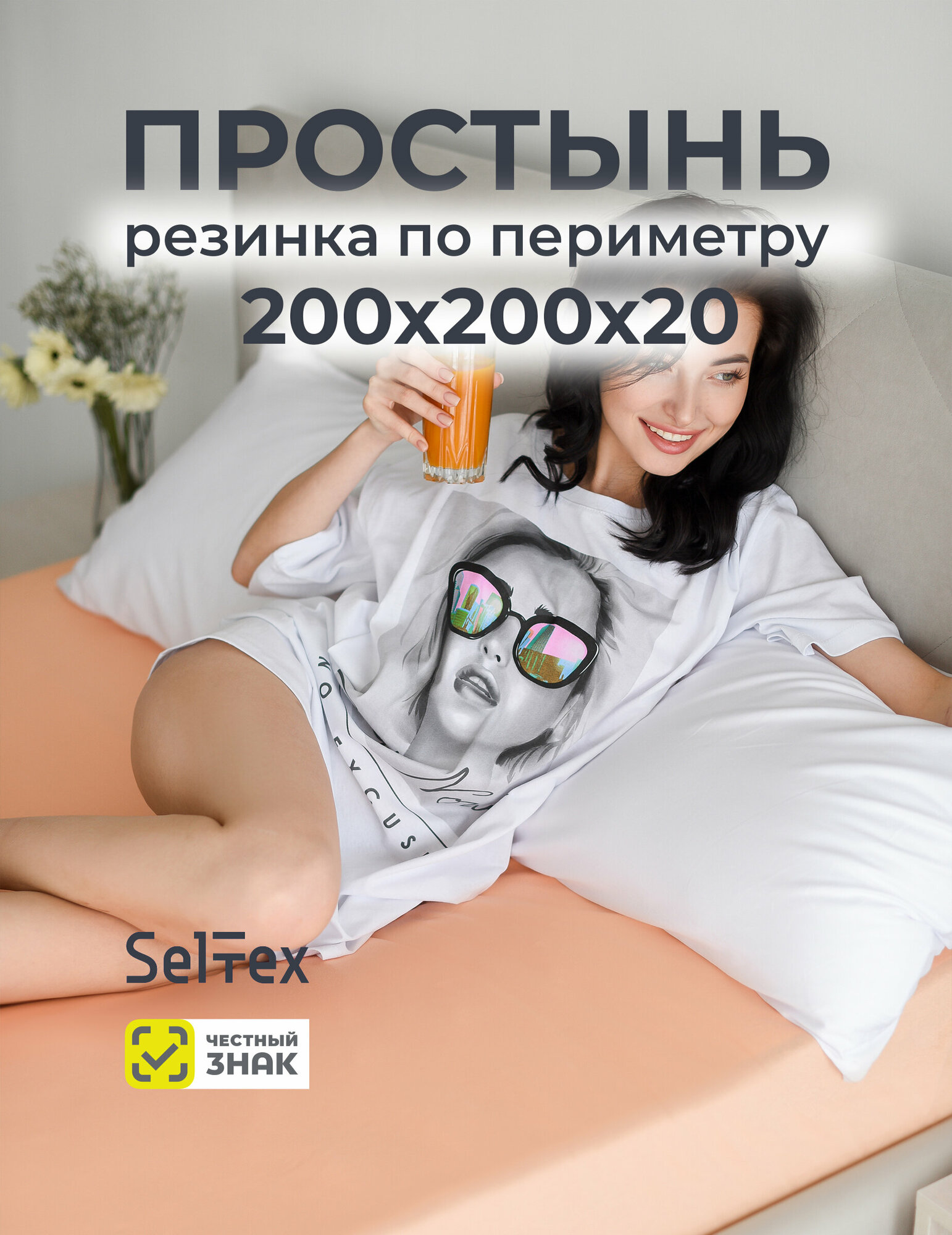 Трикотажная простыня на резинке Селтекс, 200х200х20, цвет: персик
