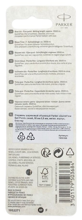 Стержень шариковый для ручки паркер Parker Quinkflow (F), металлический, 98 мм, узел 0,8 мм, блистер, синий, 170308
