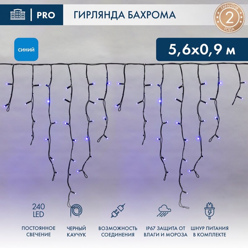 Светодиодная гирлянда "Бахрома" Neon-night 5.6х0.9 м, 240 синих светодиодов, постоянное свечение, черный каучуковый провод
