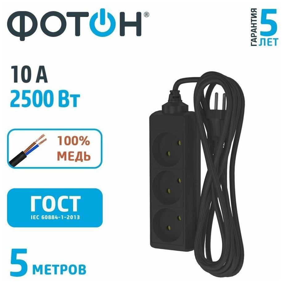 Фотон Удлинитель сетевой 10-53, 5м, 3 розетки, 10А, Черный 22720 .