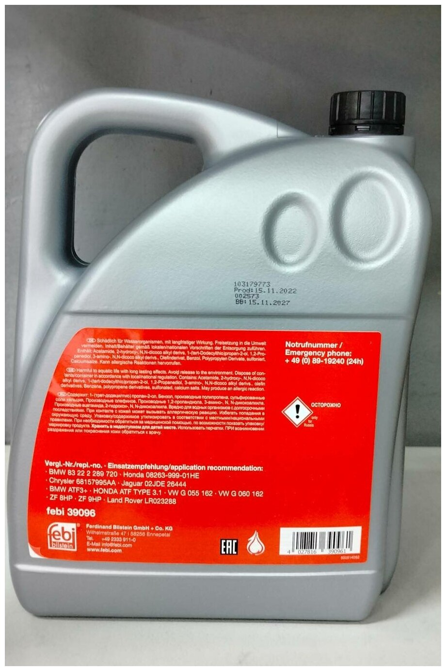 FEBI 39096 жидкость для АКПП зеленое 5L/для 8-МИ ступенчатых КПП ZF(ZF 8HP)/VW G060162/ZF S671 090 312(5*39095) 13 370 ₽