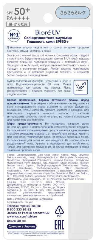 Biore Солнцезащитная эмульсия для лица UV Perfect Milk SPF 50+ PA++++ 40мл информация: