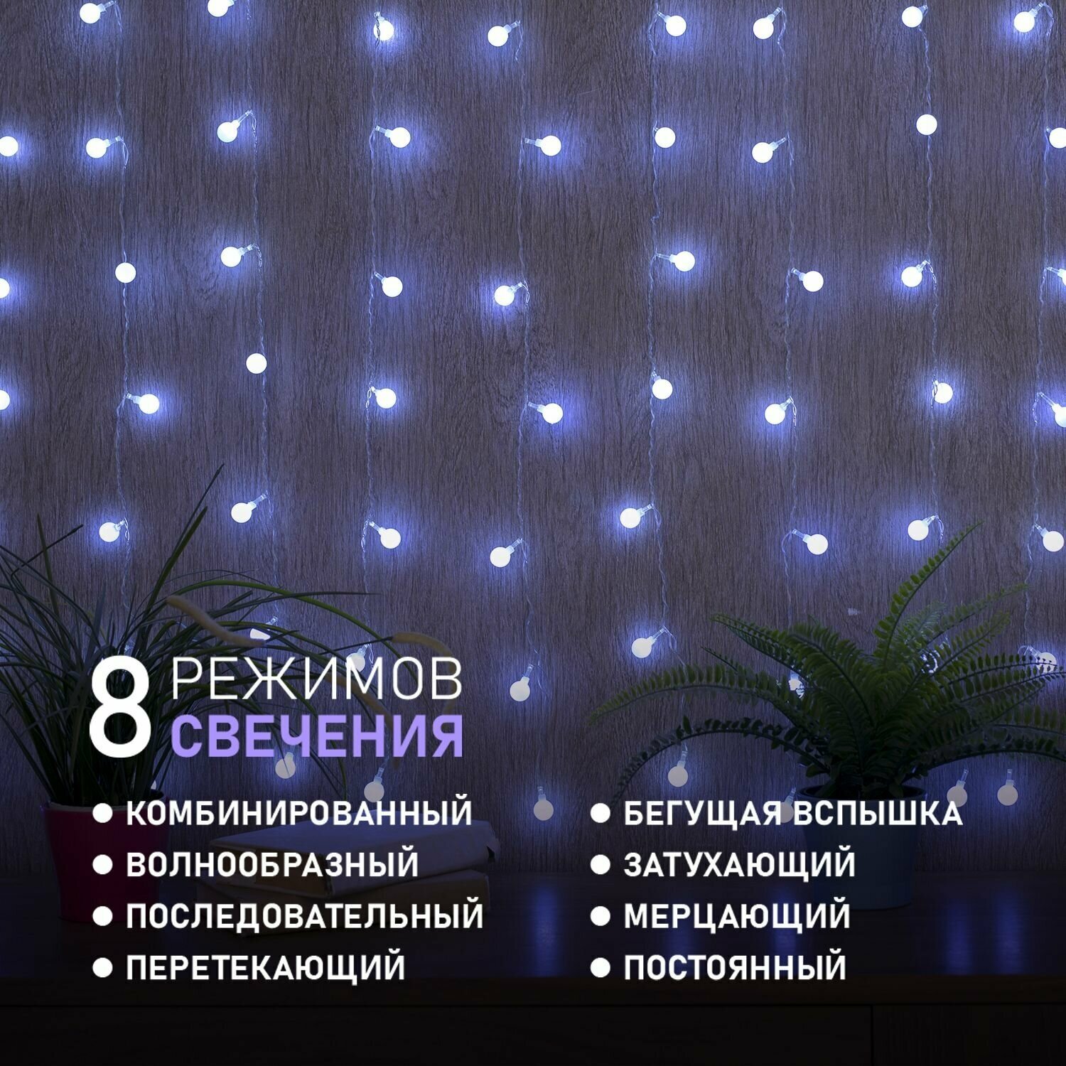 Светодиодная гирлянда NEON-NIGHT "Дождь" с насадками в виде шаров, 1.5х1.5 м, 8 режимов, 144 белых светодиодов, прозрачный провод