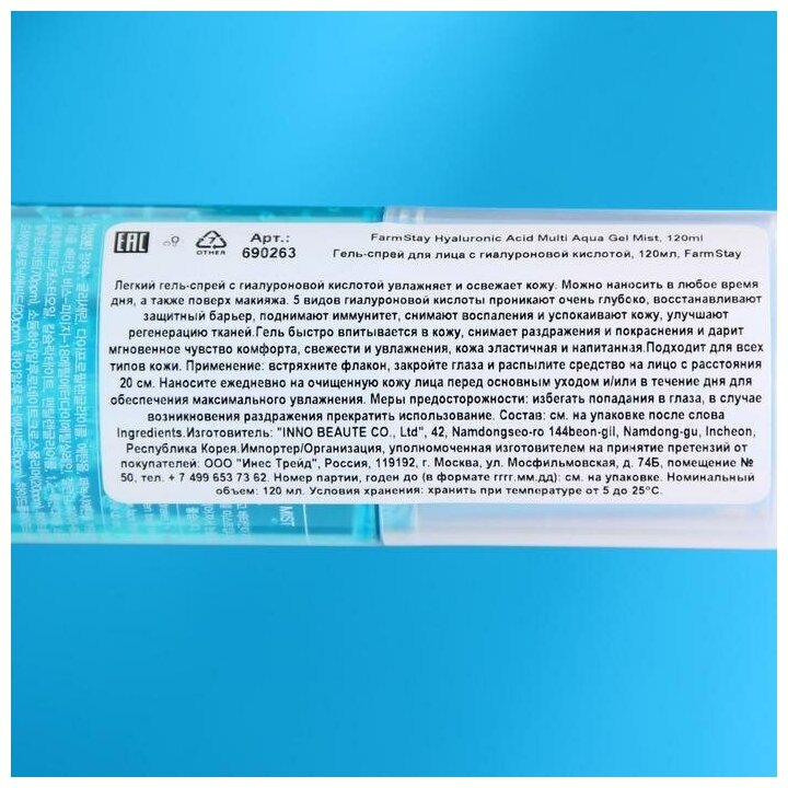 Гель-спрей для лица FARMSTAY с гиалуроновой кислотой, 120 мл информация: