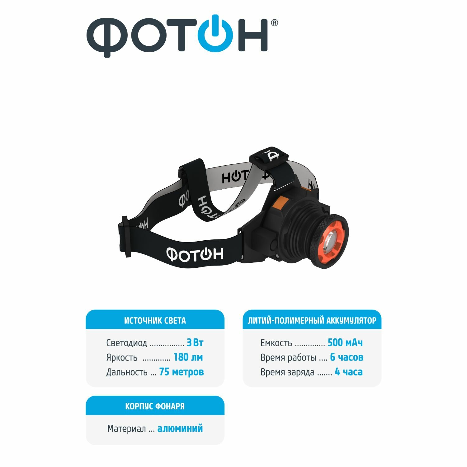 Фонарь налобный Фотон SА-900 (23084) светодиодный 1 LED 3 Вт аккумуляторный Li-Pol 500 мАч алюминий 3 режима