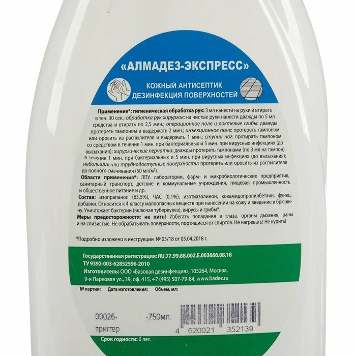 Антисептик "Алмадез-Экспресс", кожный, дезинфекция поверхностей, 750 мл (комплект из 3 шт) информация: