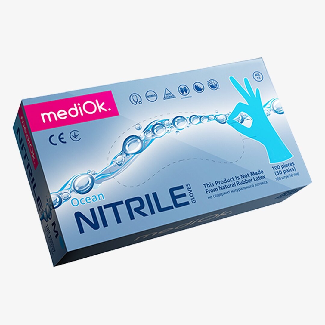 Перчатки mediOk Nitrile нитриловые, голубые, р. M, 50 пар в блоке (МедиОк)
