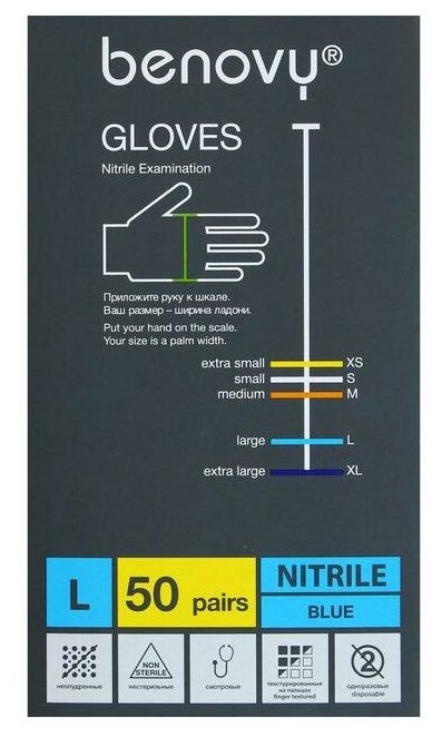 Перчатки медицинские нитриловые голубые Benovy (50) пар, одноразовые, размер L, бинови информация: