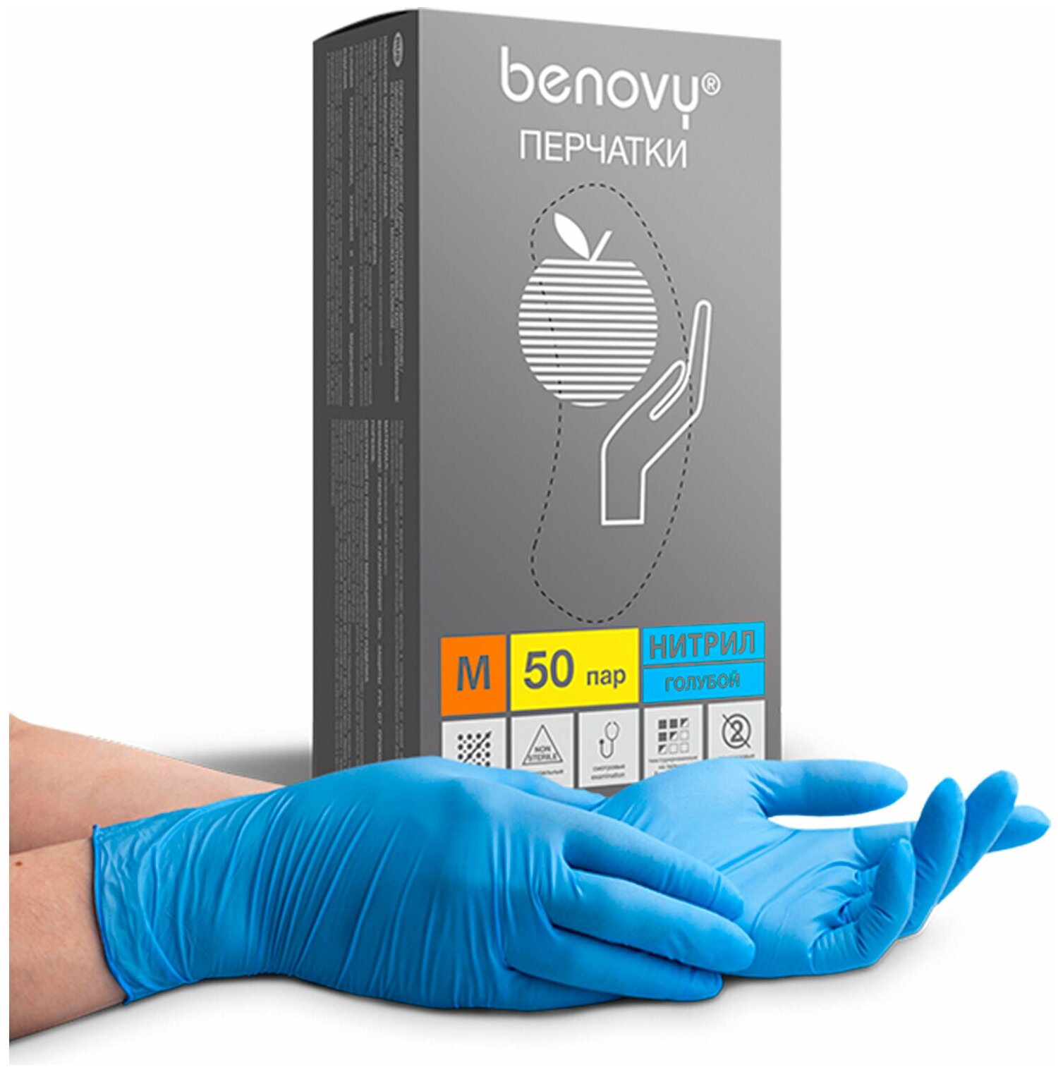 BENOVY Перчатки нитриловые одноразовые, медицинские, хозяйственные, косметологические, кулинарные, голубые, размер M, упаковка 50 пар