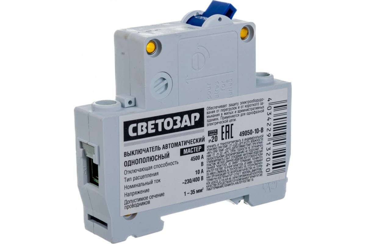 Отзывы на Выключатель СВЕТОЗАР автоматический, 1-полюсный, ″B″ (тип расцепления), 10 A, 230 / 400 В