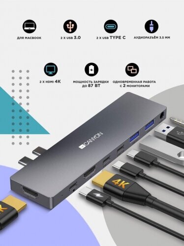 Концентратор-USB Canyon Multiport Docking Station with 8 port, 1*Type C PD100W+2*Type C data+2*HDMI+2*USB3.0+1*Audio. Input 100-240V, Output USB-C PD1 4 692 ₽