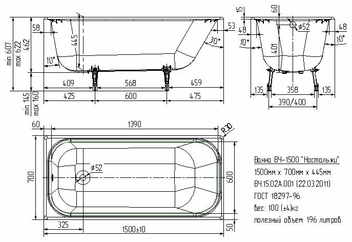 Ванна чугунная Универсал Ностальжи 150x70 информация: