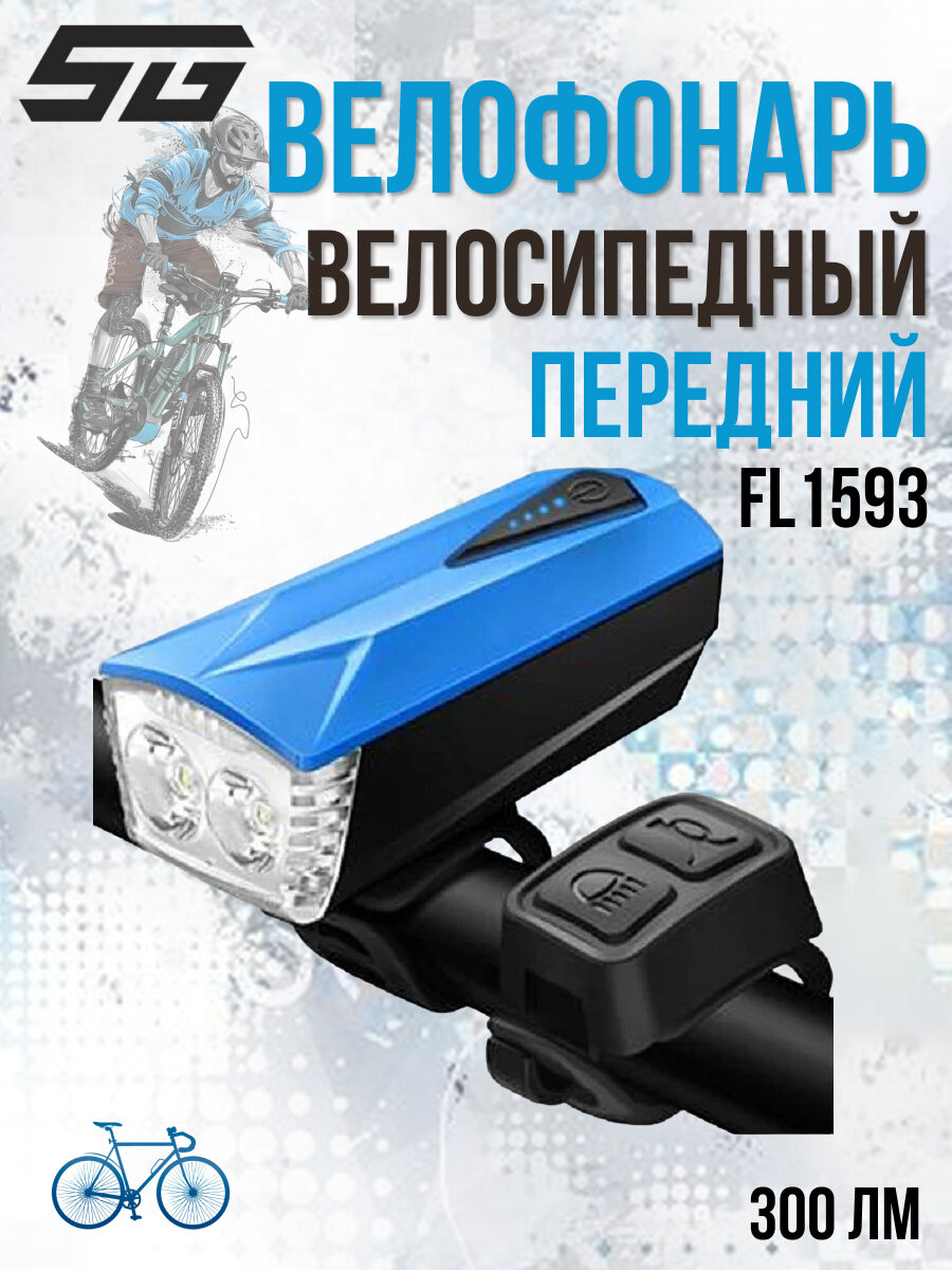 Фонарь велосипедный STG передний, FL1593, с элетросигналом, 120 ДБ, 300 lm, 1800 mAh, синий