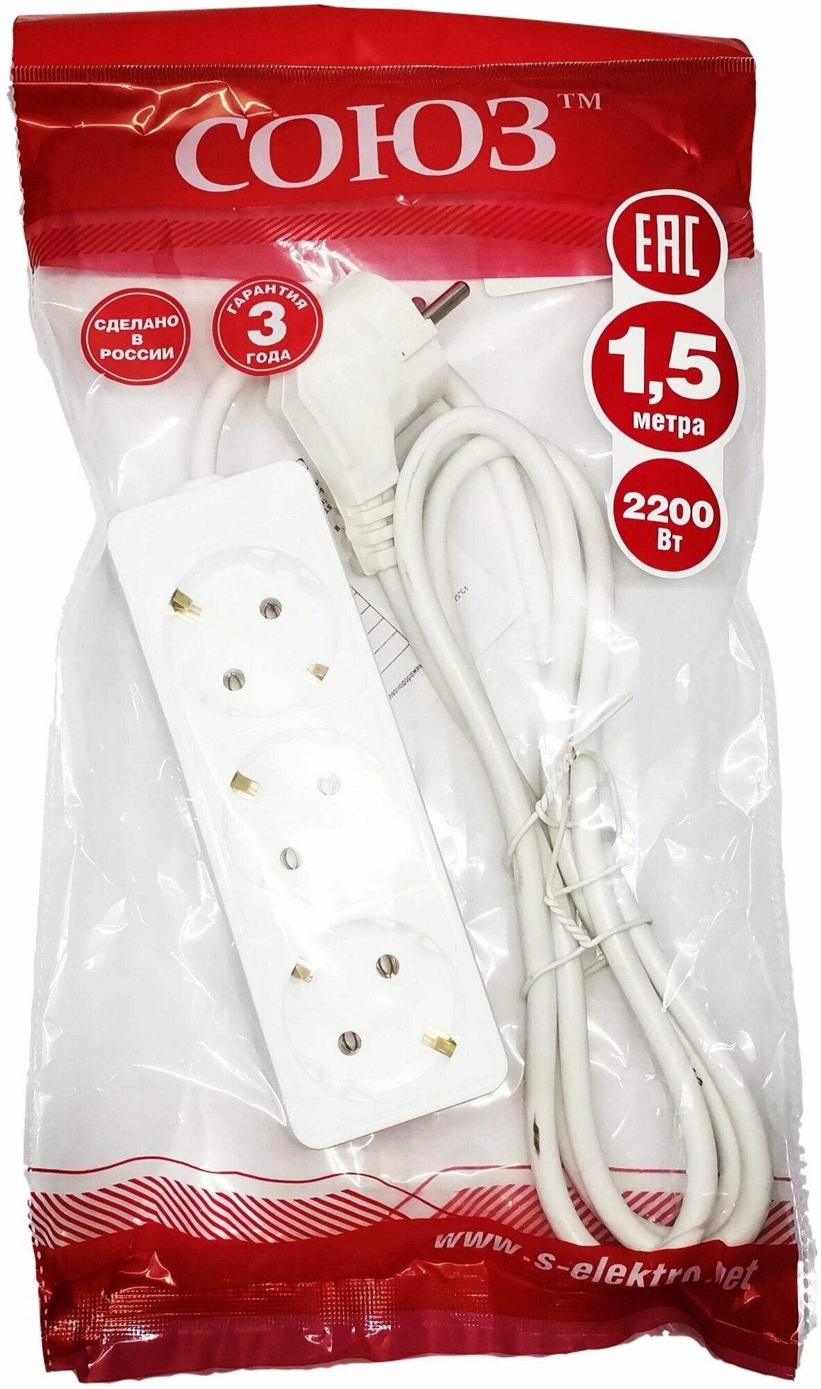 Удлинитель сетевой электрический, с заземлением, 3 гнезда, 1,5 метра 10А IP20 2.2кВт провод ПВС Союз
