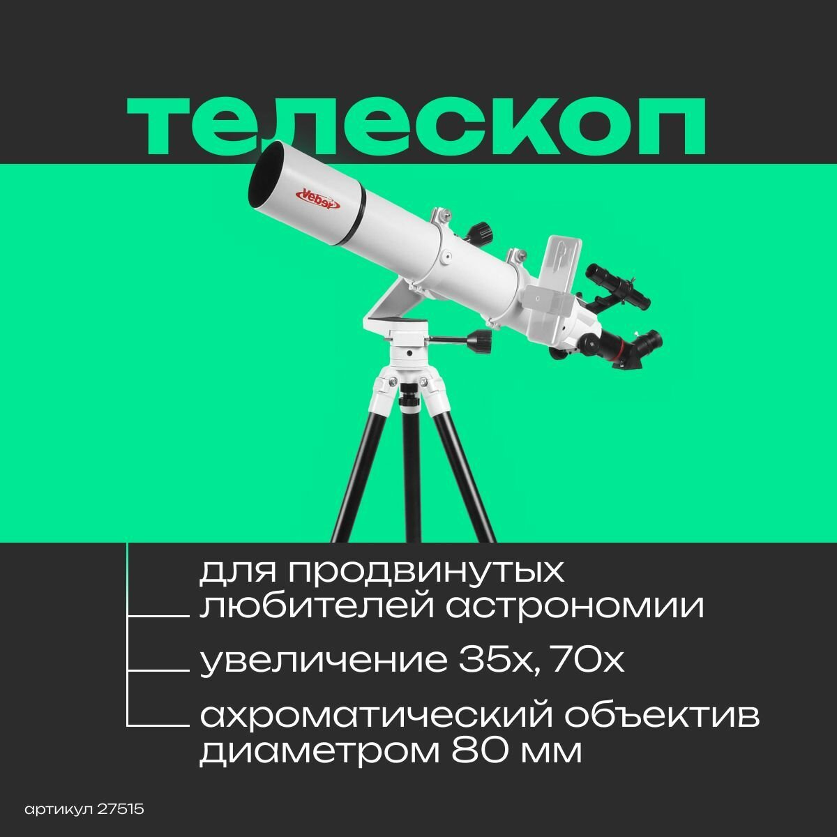 Телескоп астрономический Veber PolarStar II 700/80AZ рефрактор профессиональный информация: